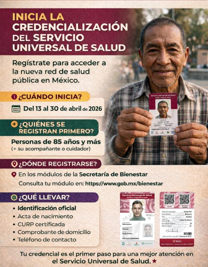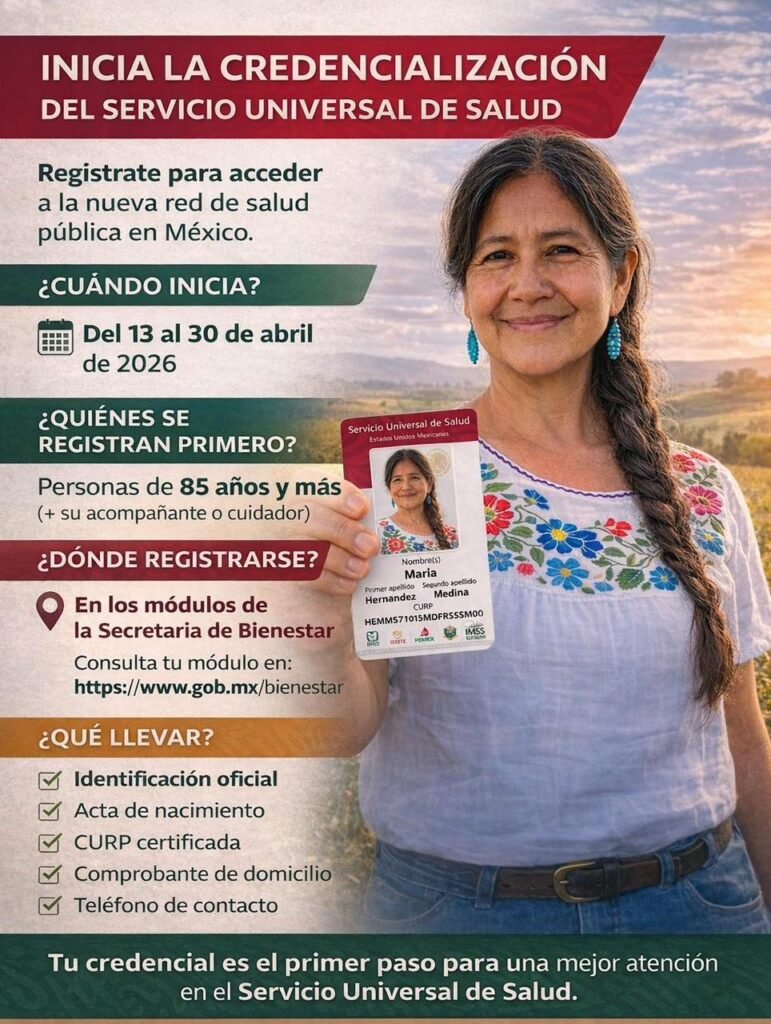 Futuro del Servicio Universal de Salud Para el año 2027, se planea que la plataforma evolucione para incluir: * Gestión de citas médicas. * Historial médico y expediente digital. * Seguimiento del programa “Salud Casa por Casa”. * Salud digital con Inteligencia Artificial y teleconsultas. “Es un paso histórico el que estamos dando, avanzando hacia el Servicio Universal de Salud”, puntualizó la Presidenta Sheinbaum.